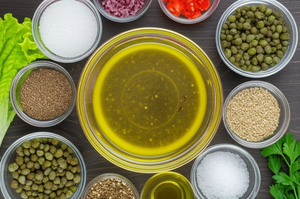 Sosy sałatkowe włoskie Knorr połącz z 6 łyżkami wody oraz 6 łyżkami oliwy. Dorzuć kapary i zamieszaj.
