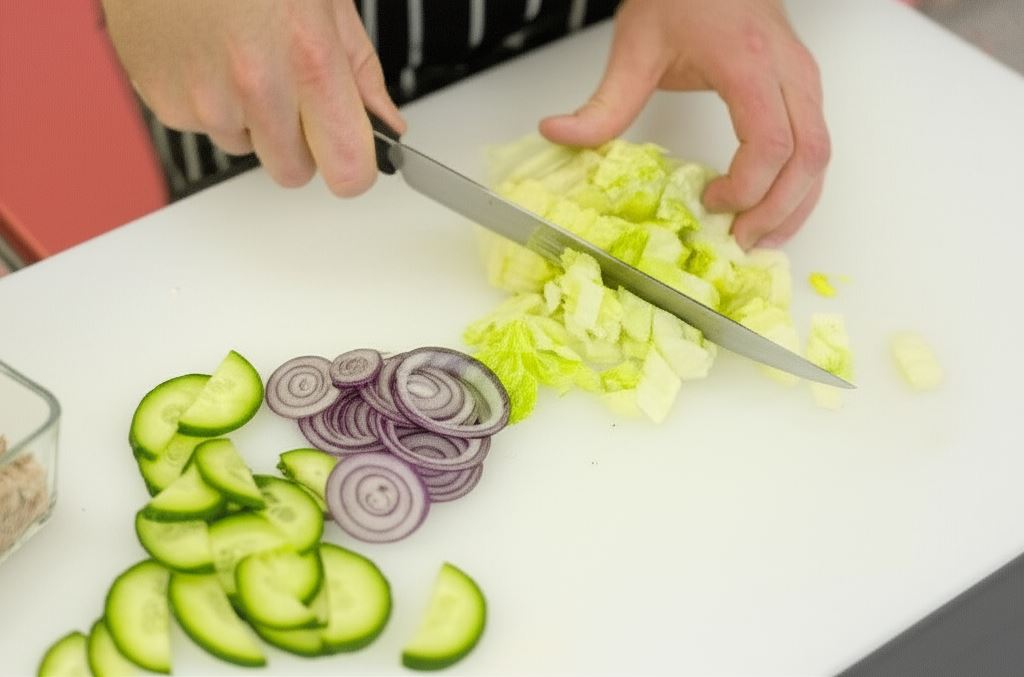 Sałatę potnij w kostkę około 1,5 centymetrową. Ogórka przetnij wzdłuż na połowę, a potem pokrój w plastry. Tuńczyka odcedź, a cebulę posiekaj w cienkie krążki.