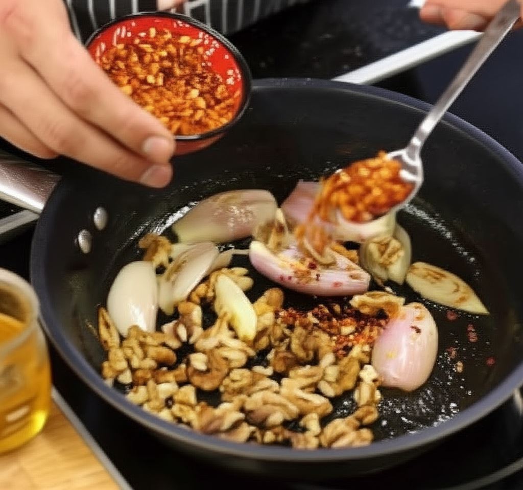 Szalotki obierz i przetnij wzdłuż na połowy. Na patelni podgrzej olej i zrumień cebulki, potem dodaj orzechy, wlej miód, wsyp Przyprawę Smokey Knorr (2 łyżeczki) i karmelizuj przez moment – pilnuj jednak, by cebulek nie przypalić. Zdejmij z patelni na papier do pieczenia i ostudź.
