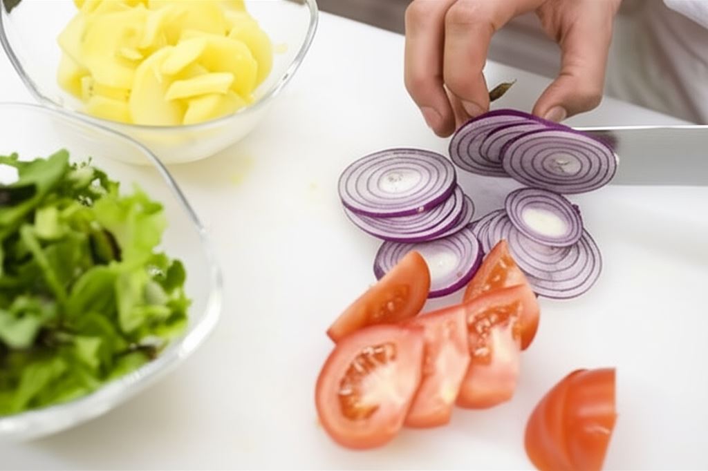 Opłucz i osusz sałatę. Potem opłucz pomidory, pokrój je na ósemki. Obierz i opłucz cebulę, a następnie pokrój ją w krążki.