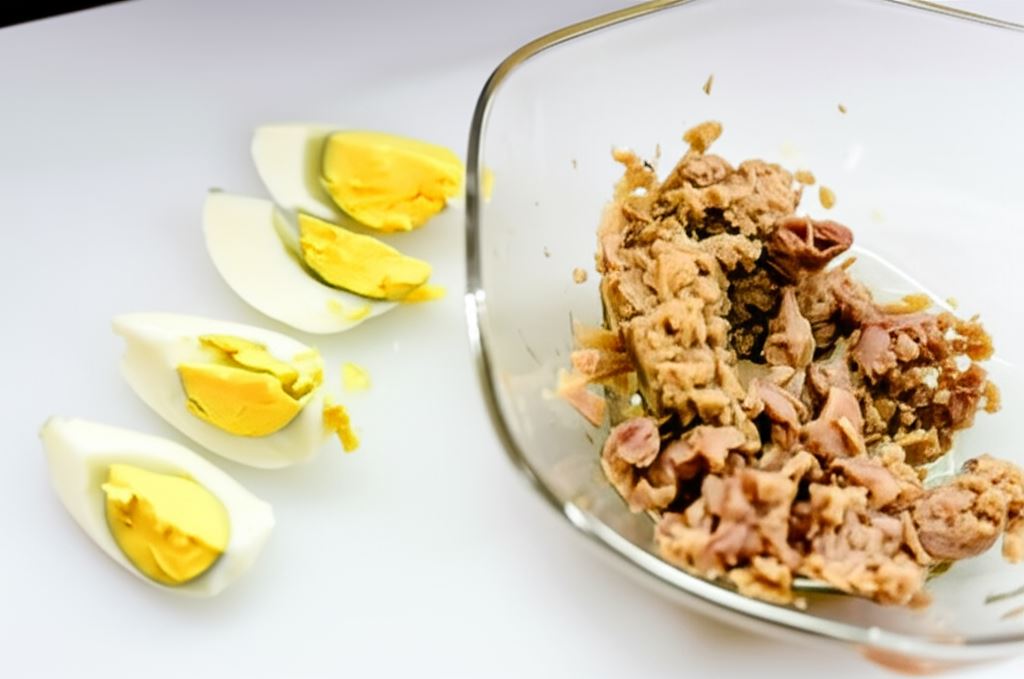 Ugotuj jajka na twardo, obierz i przekrój na ćwiartki. Odcedź tuńczyka z zalewy.