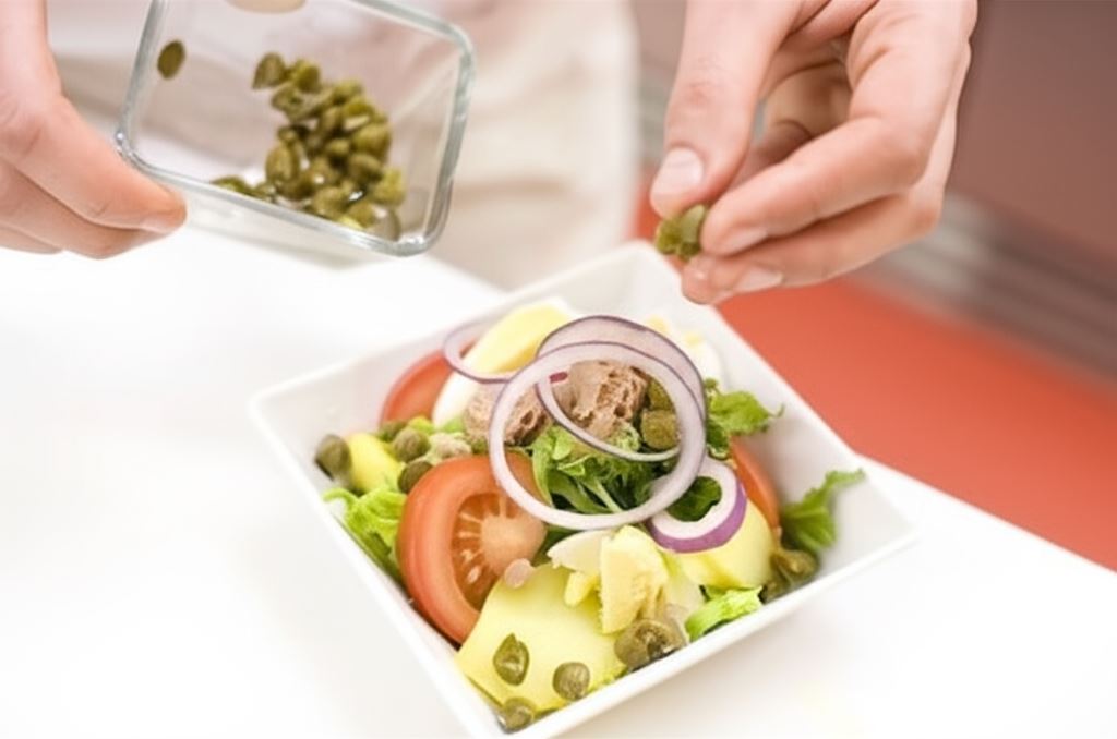 Kapary dodają sałatce charakterystycznego, lekko pikantnego akcentu. Te małe pączki kwiatowe rośliny o nazwie kapary cierniste są zbierane i marynowane, co nadaje im intensywny, słono-kwaśny smak, który doskonale komponuje się z delikatnością tuńczyka i ziemniaków.