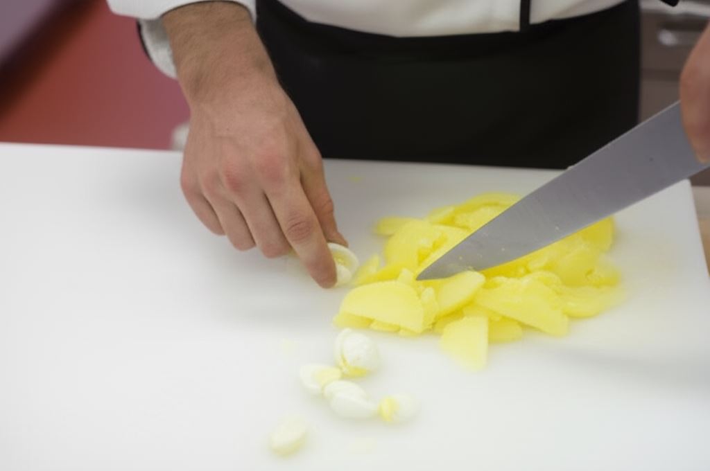 Ziemniaki ugotuj w mundurkach, ostudź i obierz. Po ostudzeniu przekrój każdy ziemniak wzdłuż na połowę, a potem w cienkie plastry. Jajka ugotuj na twardo, ostudź i przekrój na połówki.