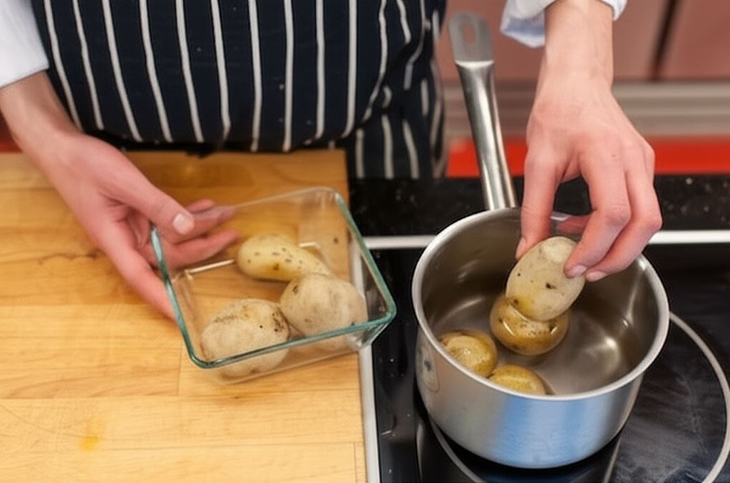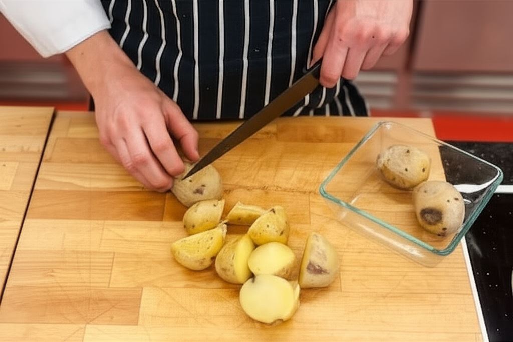 Po ugotowaniu odcedź ziemniaki, pozostaw do wystygnięcia i na koniec przekrój je na połówki.