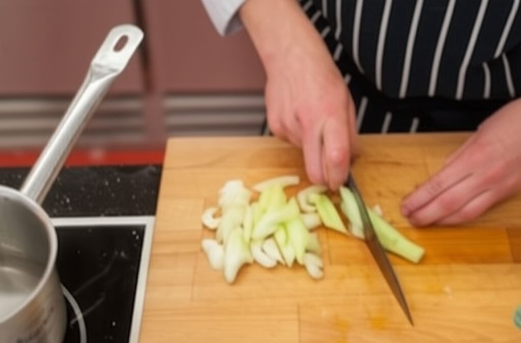 Selera naciowego oczyść z włókien, potnij ukośnie w paski i zblanszuj we wrzątku, by zmiękł.