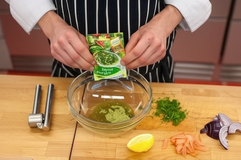 Teraz przygotuj sos koperkowy: czosnek zetrzyj na małej tarce, Sos sałatkowy Knorr wymieszaj z olejem, wodą, czosnkiem i sokiem z cytryny.