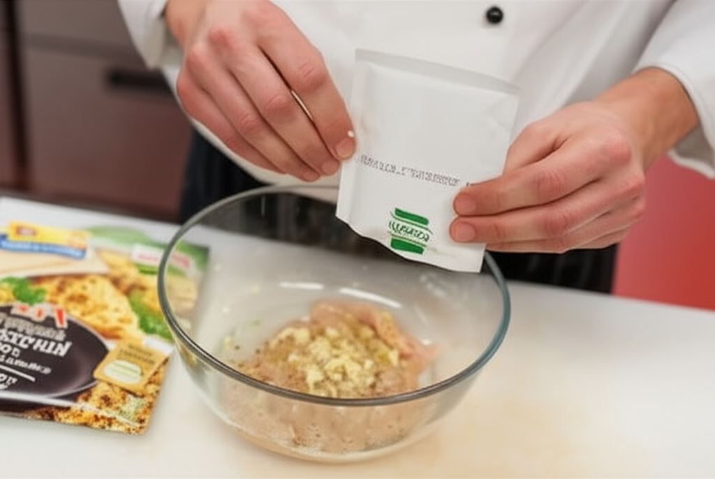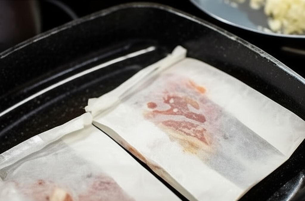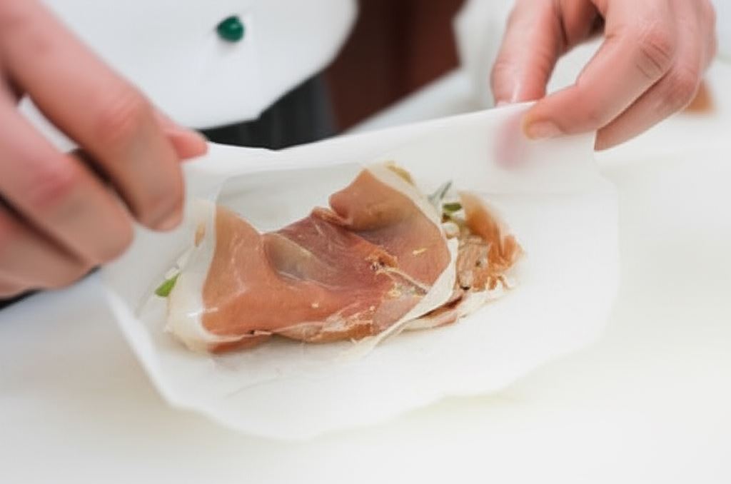 Włóż teraz mięso, po jednej porcji, do torebek pergaminowych.