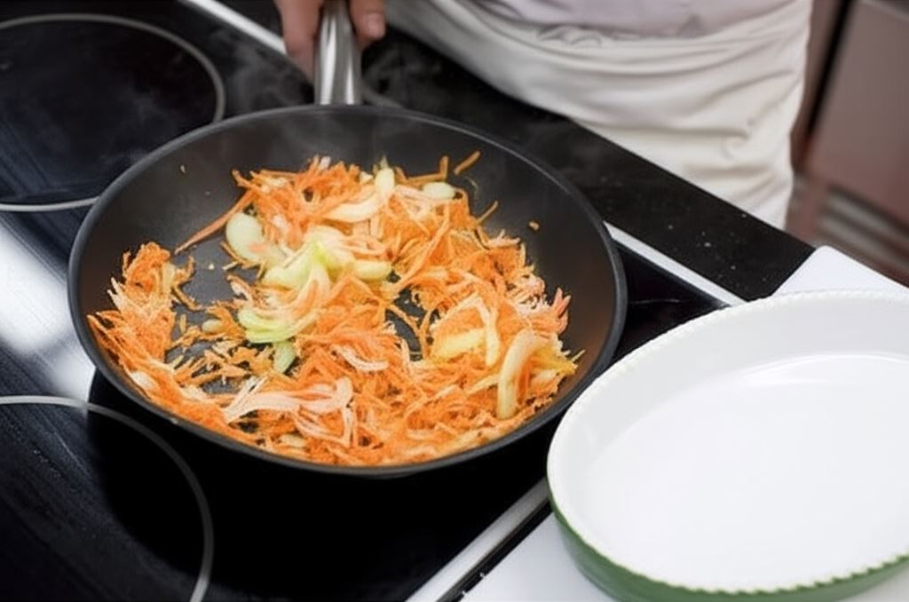 Zrumień wszystkie warzywa na oleju przez około 7 minut, potem dopraw pieprzem i przenieś do naczynia żaroodpornego.