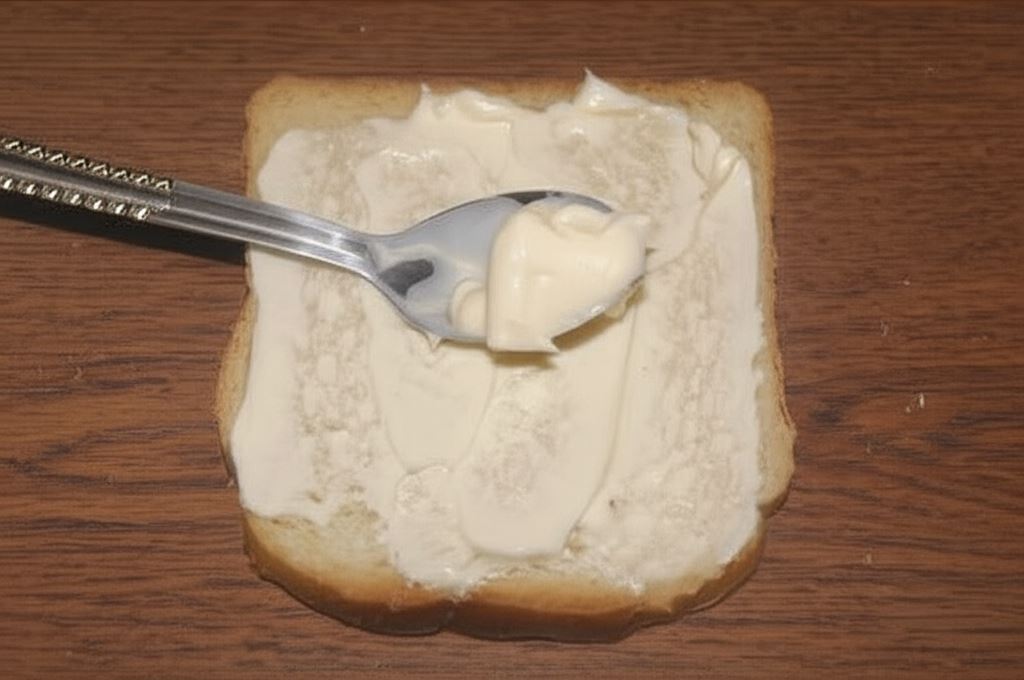 Przygotować komponenty (pokroić pomidory i ogórek) - rozdzielić na 2 części do każdych 3 kromek pieczywa. Rozdrobnić kostkę czosnkową. Wykonujemy 2 porcje: Pierwszą kromkę chleba tostowego posmarować majonezem.