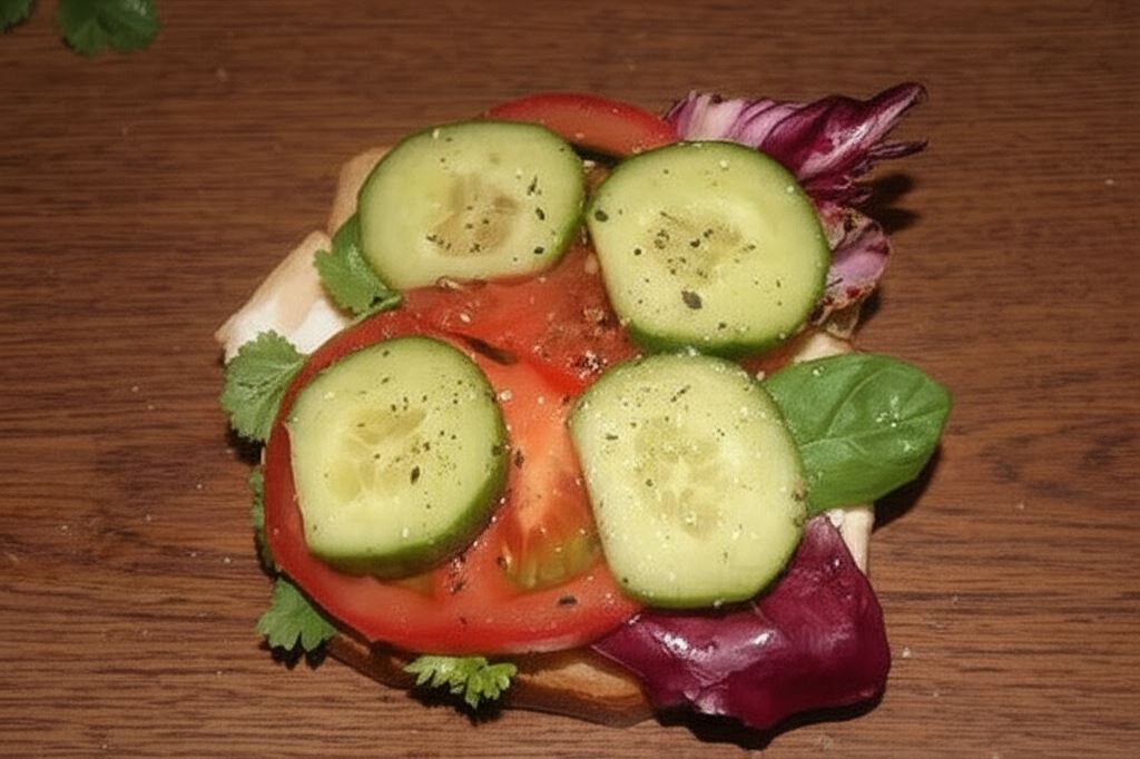 Umieścić plastry pomidora, ogórka, zieleninę - obsypać pokruszoną kostką czosnkową i oprószyć pieprzem. Nakryć posmarowaną (od spodu majonezem kromką chleba tostowego).
