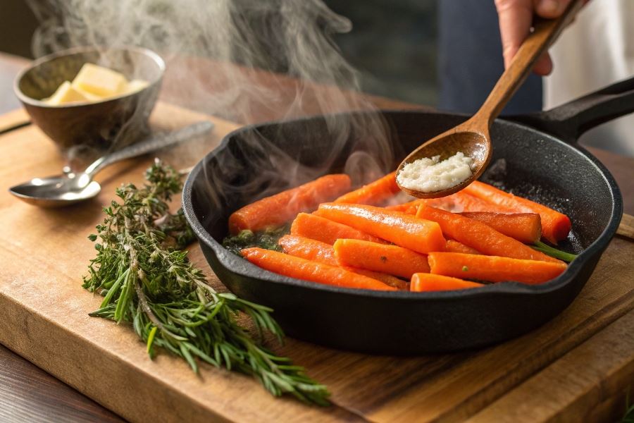 Blanszowanie w bulionie zamiast w wodzie dodatkowo wzbogaca smak marchewki. Po blanszowaniu marchewkę należy dokładnie osuszyć przed przystąpieniem do zasmażania, co zapobiegnie rozpryskom tłuszczu i zapewni lepszą karmelizację.
