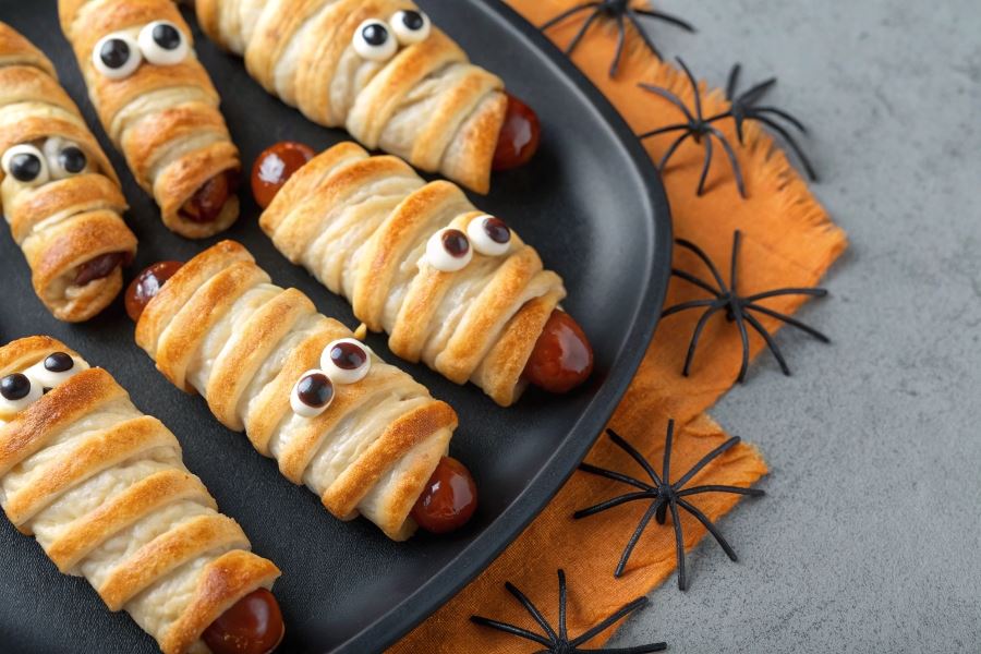 Przygotowanie mumii z ciasta francuskiego to doskonały sposób na wprowadzenie halloweenowego klimatu podczas przyjęcia. Gotowe ciasto francuskie pokrój na cienkie paski, a następnie owiń nimi kiełbaski, pozostawiając małą przestrzeń na „twarz”. Po upieczeniu w temperaturze 200°C przez około 15 minut, dodaj dwa punkty z majonezu jako oczy. Efekt wizualny jest niesamowity, a smak zachwyci zarówno dzieci jak i dorosłych.