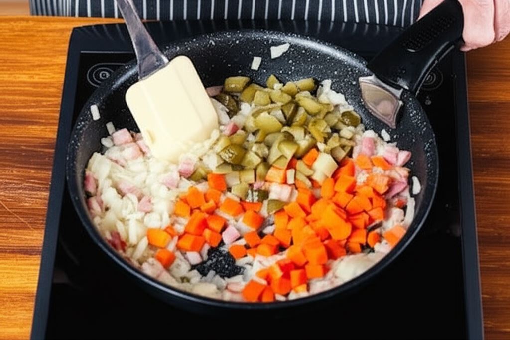 Cebulę, boczek, marchew i ogórka pokrój w bardzo małą kostkę i razem wszystko podsmaż.