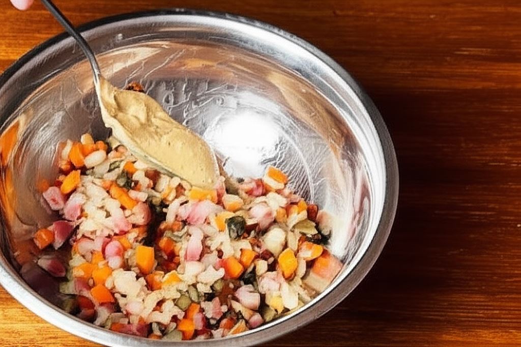 Gdy składniki się podsmażą i zmiękną, przenieś je do miseczki i dorzuć musztardę. Porządnie zamieszaj i pozostaw do wystygnięcia.