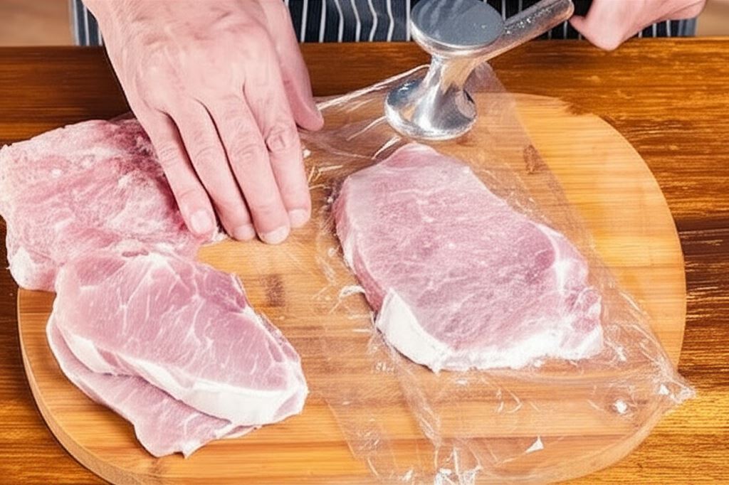 Schab podziel na mniejsze porcje i każdą ubij tłuczkiem na cienki płat.