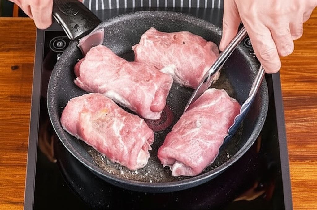 Przygotowane zrazy podsmażaj na patelni aż uzyskają rumianą barwę.