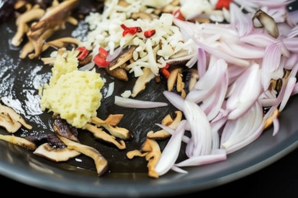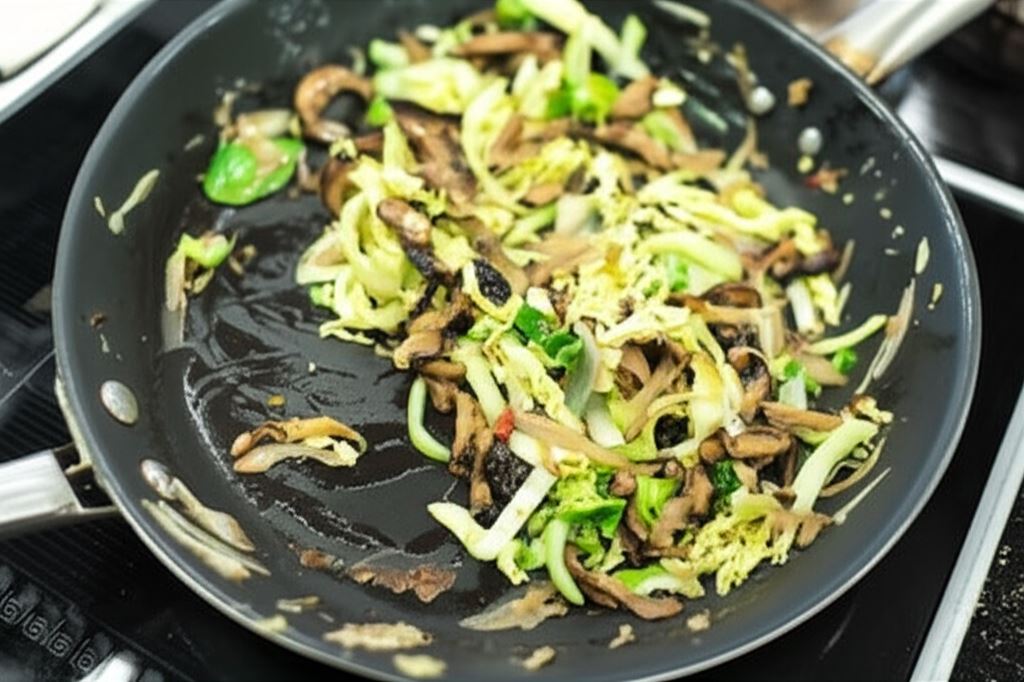 Grzyby wrzuć na rozgrzaną patelnię, dodaj dwie łyżki zwyczajnego oleju i trzy łyżki oleju sezamowego. Dodaj szalotkę, czosnek, chili i kapusty bok choy, wszystko razem podsmaż moment, a potem dodaj imbir i sos sojowy. Wymieszaj kilkakrotnie.
