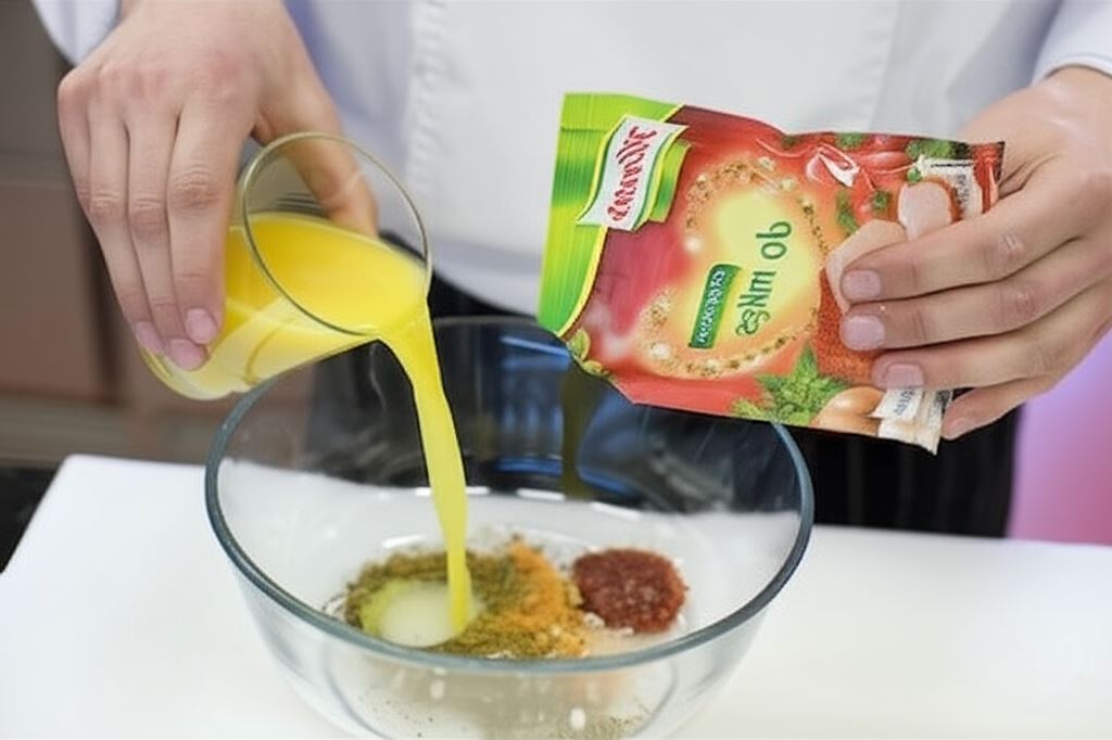 W misce połącz składniki marynaty: sok pomarańczowy, kminek, posiekany czosnek, skórki i sok z limonki, kolendrę, olej, sambal oelek oraz przyprawę Knorr.