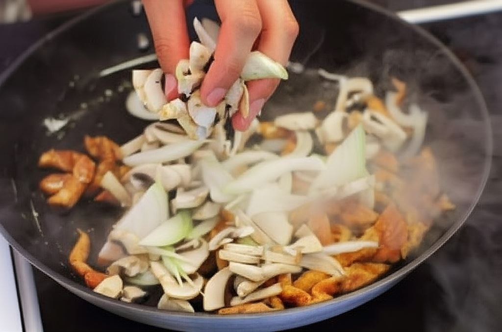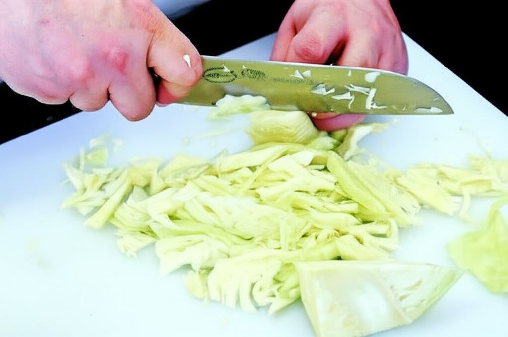 W międzyczasie poszatkuj kapustę, pokrój grzyby na plasterki, a cebulę na piórka.