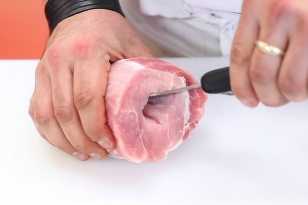 Schab opłucz i pozbądź się błon. Potem za pomocą długiego, cienkiego noża zrób otwór wzdłuż schabu w jego środkowej części.
