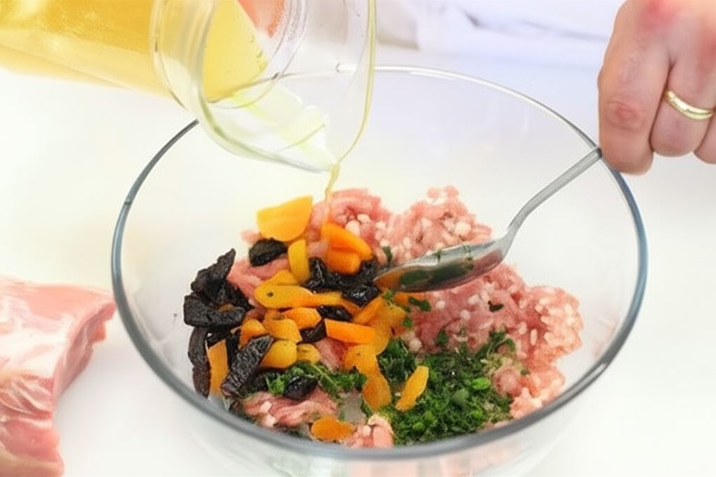 Przełóż mięso mielone do miski, wsyp bulion, dodaj posiekaną natkę oraz pokrojone śliwki i morele. Wszystko dokładnie wymieszaj i przypraw pieprzem.