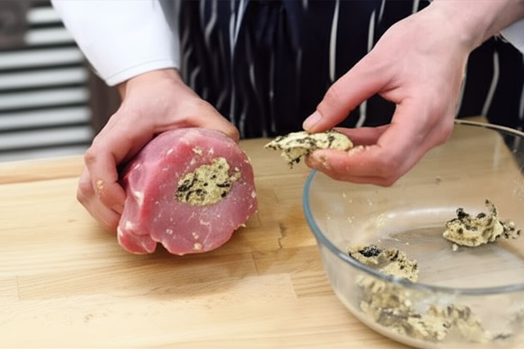 W utworzony otwór wkładaj nadzienie. Postaraj się dokładnie wypełnić mięso.