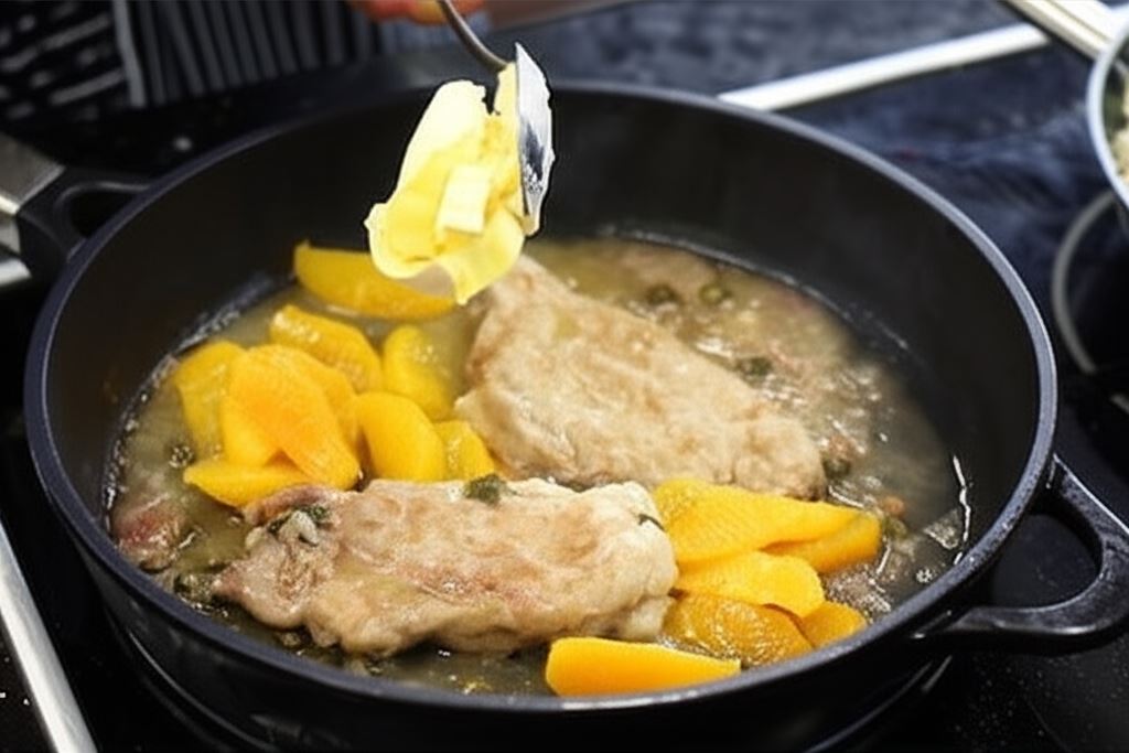 Kapary dodane do sosu wprowadzają delikatnie słoną nutę, która doskonale równoważy słodycz cytrusów. Białe wino w trakcie duszenia odparowuje, pozostawiając jedynie subtelny aromat, który podkreśla smak mięsa. Segmenty cytrusów dodane na końcu gotowania zachowują swoją świeżość i soczystość.