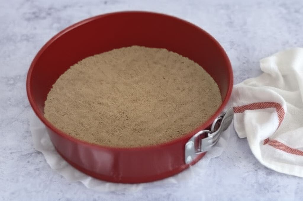 Sporządź spód. Herbatniki rozdrobnij w malakserze. Rozpuść masło i wymieszaj łyżką z herbatnikami. Umieść masę herbatnikową na spodzie tortownicy, wyścielonej papierem do pieczenia. Wygładź masę. Wstaw tortownicę ze spodem do lodówki na około 10 minut.