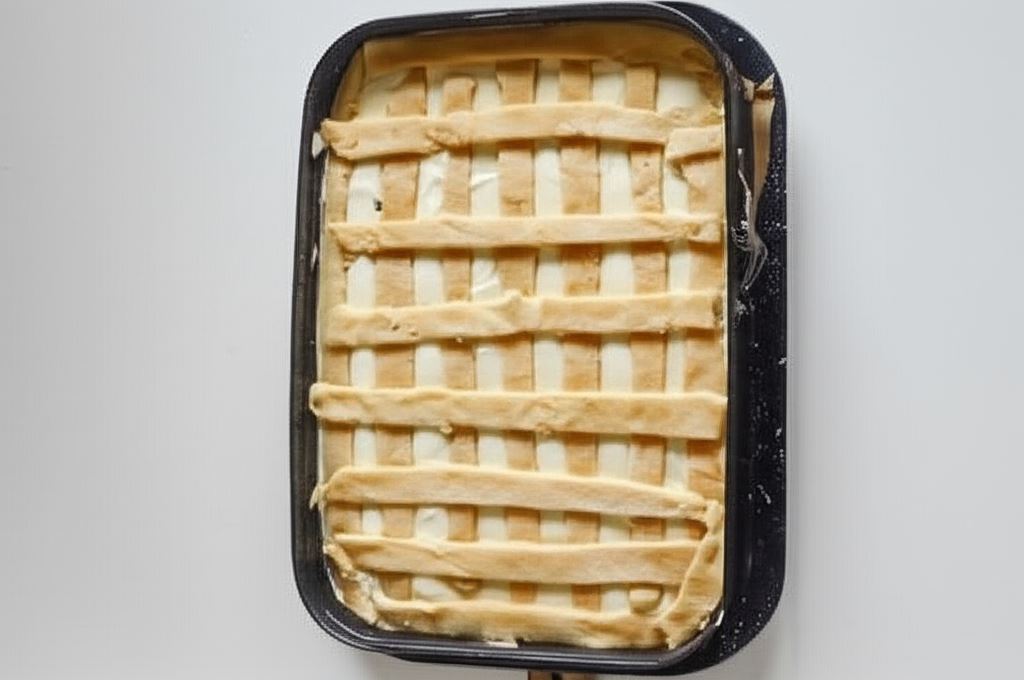 Na podpieczony spód wylewamy masę serową. Ostatnią część ciasta rozwałkowujemy. Tniemy na paski. Rozkładamy na masie serowej. Sernik wypiekamy przez ok. 60 minut. Chłodzimy w piekarniku.