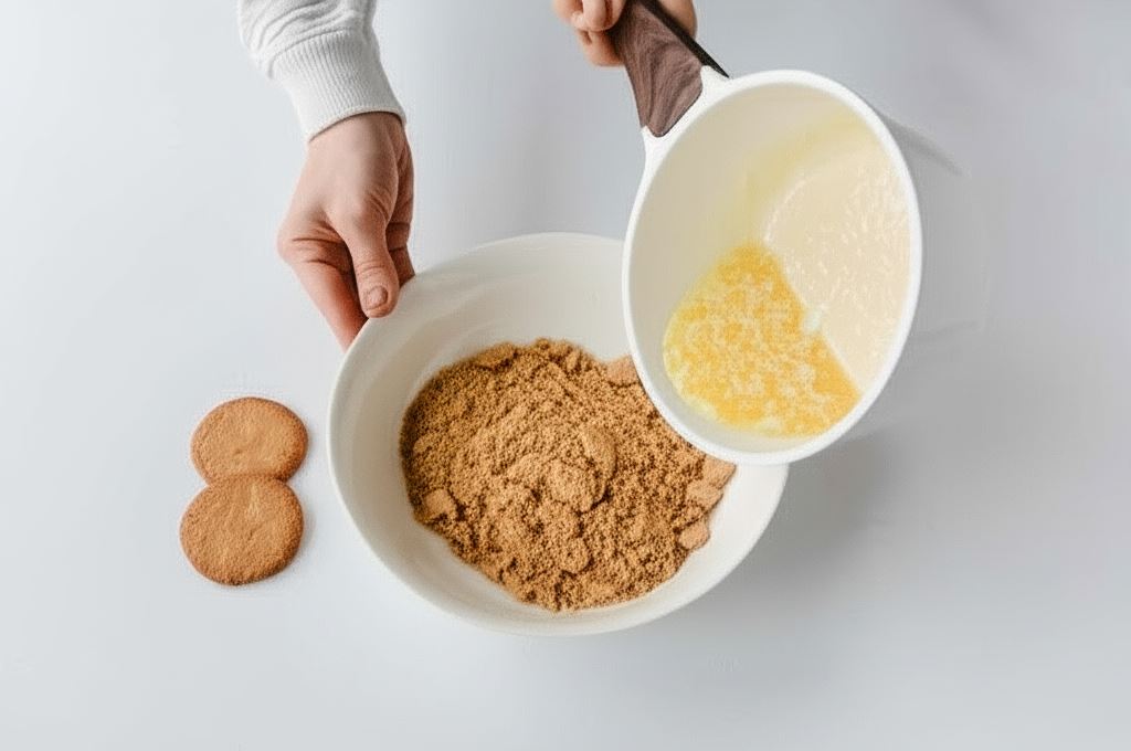 Herbatniki miażdżymy blenderem na proszek i wsypujemy do miski. Dodajemy stopione masło. Wszystko mieszamy, aż uzyskamy wilgotną kruszonkę.