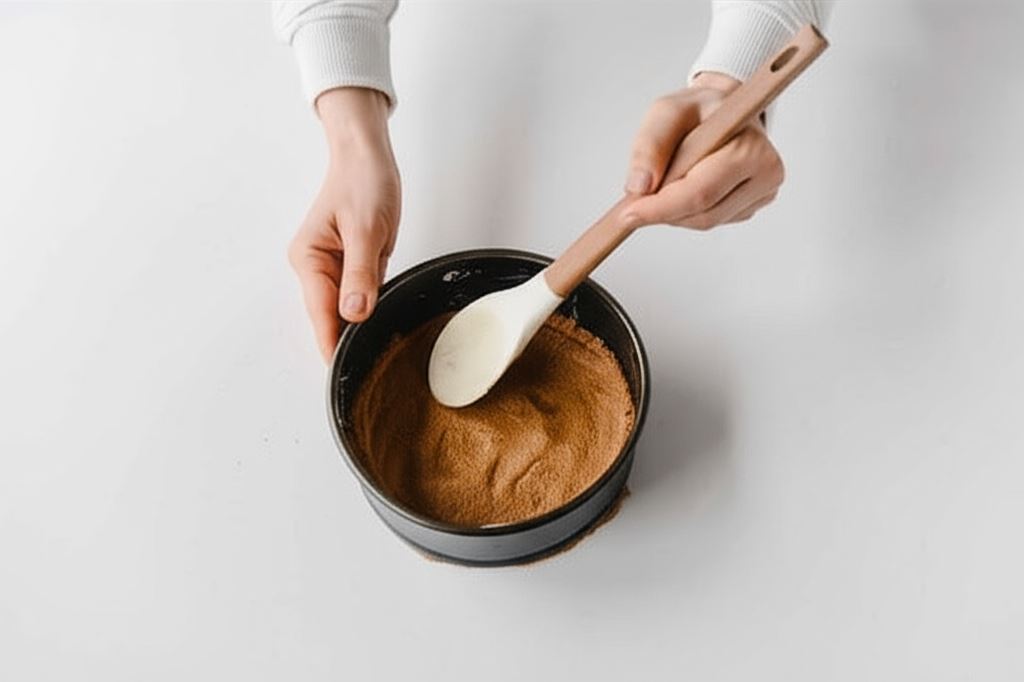 Formy tortowe wyścielamy papierem do pieczenia. Mieszankę wsypujemy na spód, uciskamy i kształtujemy podstawę. Odstawiamy do chłodziarki na 30 min.