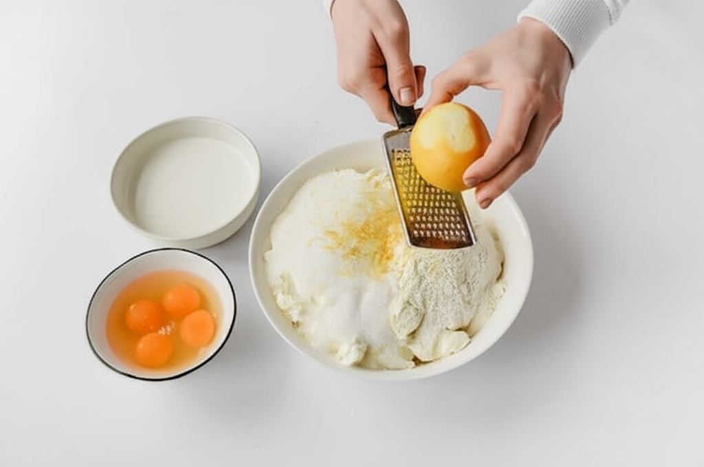 Wszystkie składniki powinny mieć temperaturę pokojową. Twaróg wkładamy do miski. Wsypujemy cukier, mąkę pszenną, startą skórkę cytrynową, dodajemy śmietanę, 3 jajka i jedno żółtko. Całość miksujemy krótko, tylko do momentu połączenia składników.