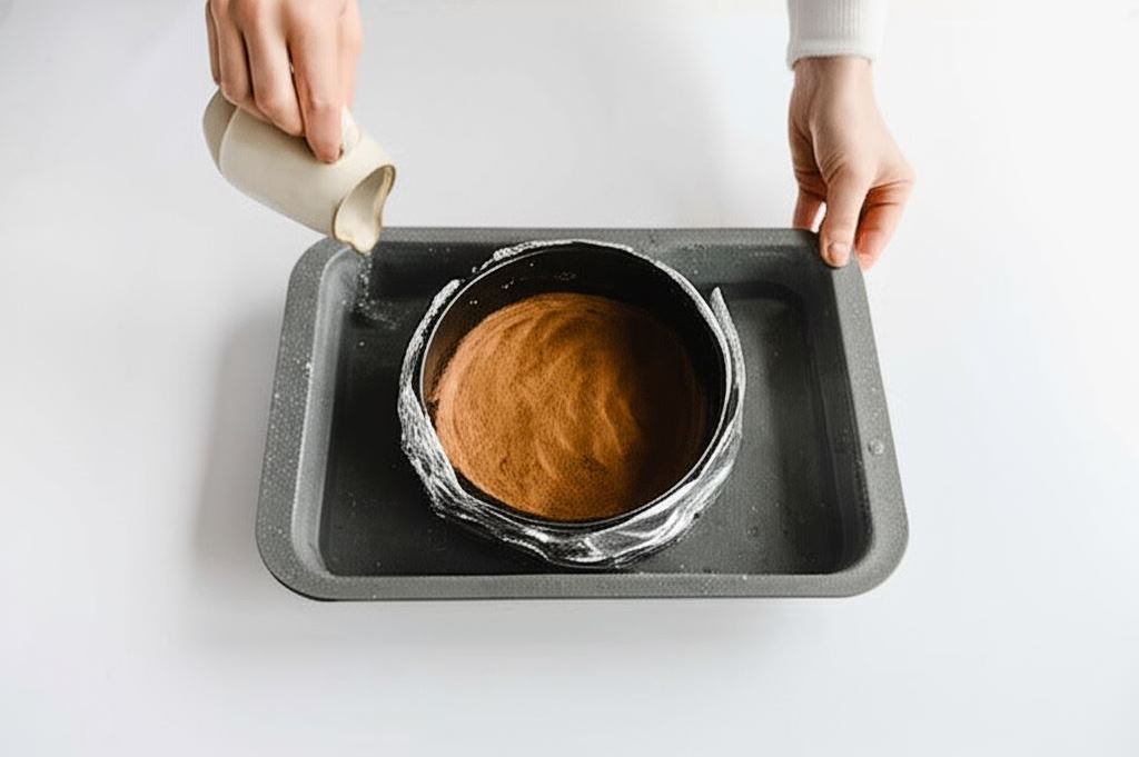 Formę tortową wyciągamy z chłodziarki i okrywamy folią aluminiową. Do większej formy wkładamy tortownicę. Nalewamy gorącą wodę do około połowy formy.