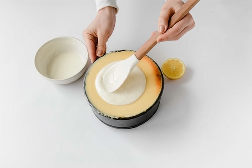 Śmietanę mieszamy z cukrem i sokiem z cytryny. Po ostygnięciu pokrywamy sernik przygotowaną polewą. Sernik wstawiamy do lodówki najlepiej na całą noc.