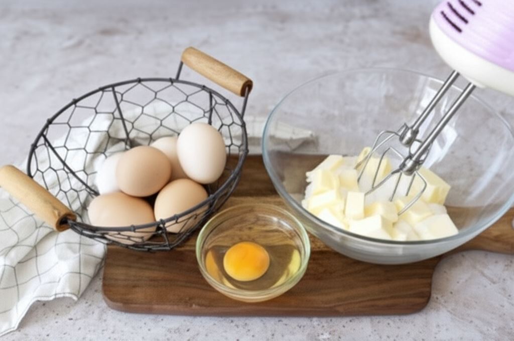 Miękkie masło utrzyj z cukrem. Następnie dodawaj jajka po kolei i zmiksuj aż się połączą.