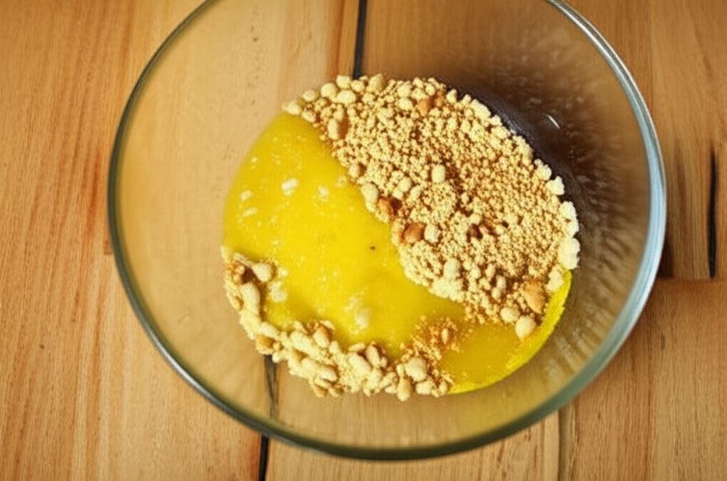 Okrągłą formę posmaruj masłem. Herbatniki i orzechy ziemne umieść w malakserze i rozdrobnij. Wsyp do miski, dodaj stopione w rondelku masło i cynamon.
