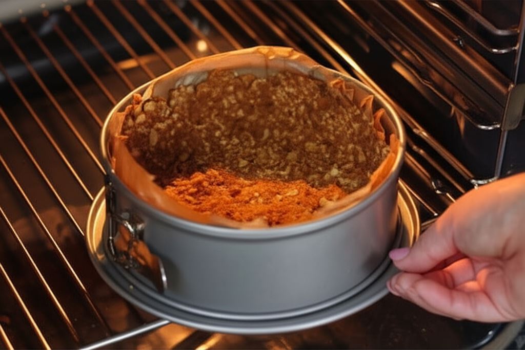 Spód i brzegi formy wyłóż kruszonką. Umieść w piekarniku rozgrzanym do 180°C i piecz przez 10 minut. Wyjmij i odstaw do ostygnięcia.