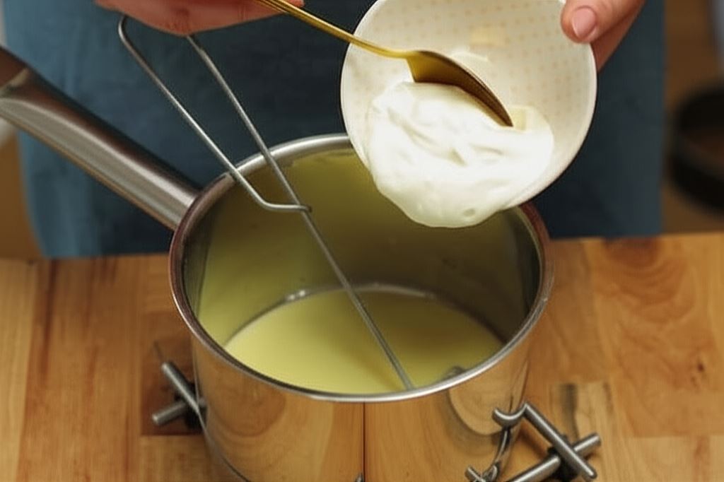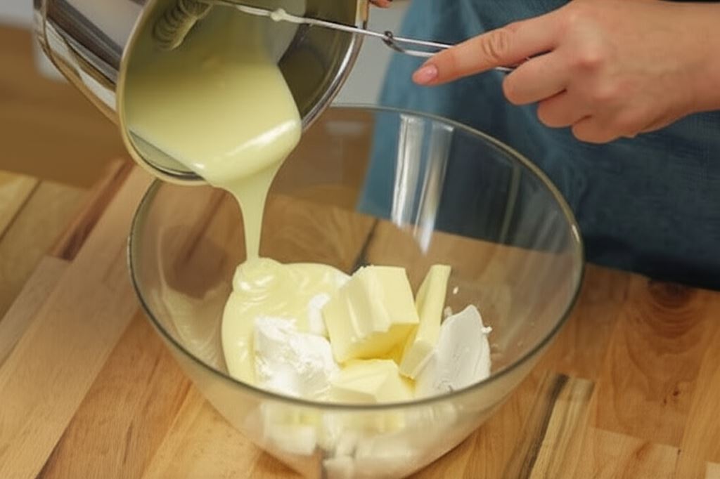 Sporządź masę serową. Mleko razem z pokruszoną białą czekoladą podgrzej w rondelku, mieszając aż do rozpuszczenia. Odstaw z ognia, wlej śmietanę i zamieszaj.