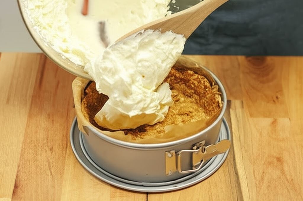 Masę z sera przenieś na wychłodzony spód i rozprowadź wyrównując powierzchnię. Wstaw na parę godzin do lodówki.