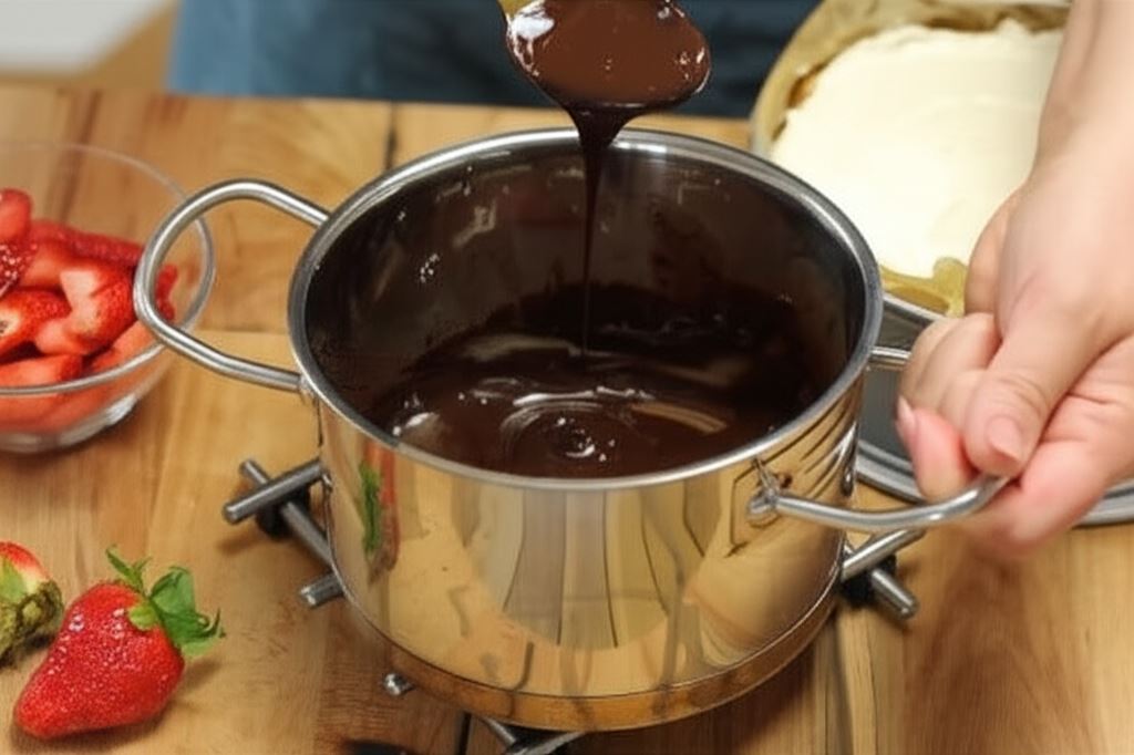 Przygotowane ciasto oblej roztopioną czekoladą i przystrój przepołowionymi truskawkami.