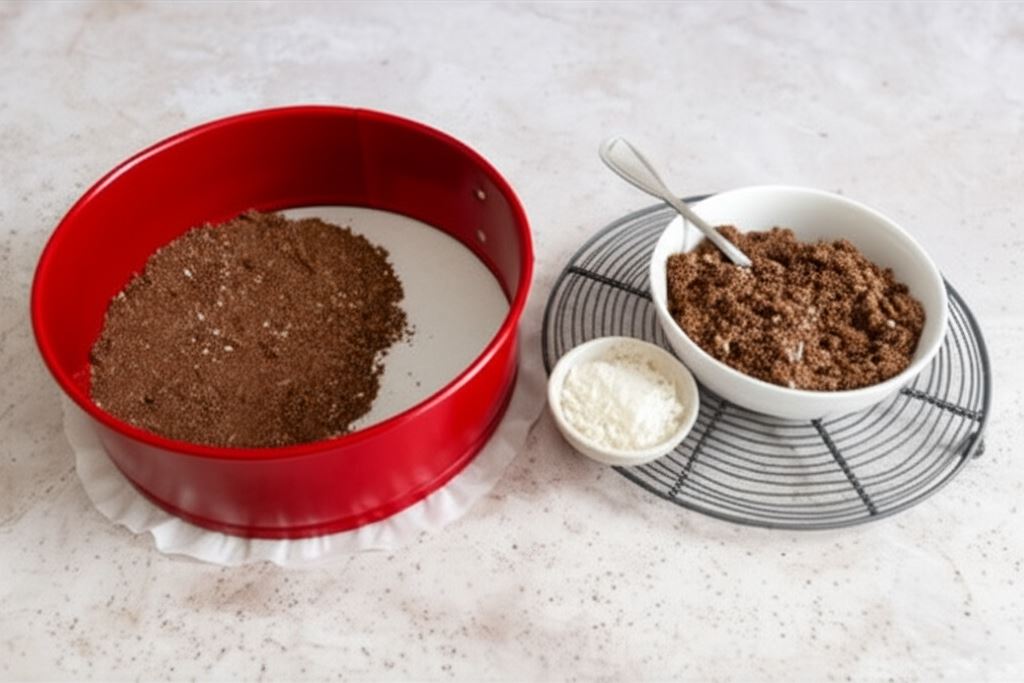 Przygotuj podstawę. Herbatniki wraz z kakao rozdrobnij w malakserze. Wsyp wiórki kokosowe. Rozpuść masło i wymieszaj łyżką z masą herbatnikową. Przenieś masę na spód tortownicy, wyścielonej papierem do pieczenia. Wygładź. Wstaw tortownicę z podstawą do lodówki na ok. 10 minut.