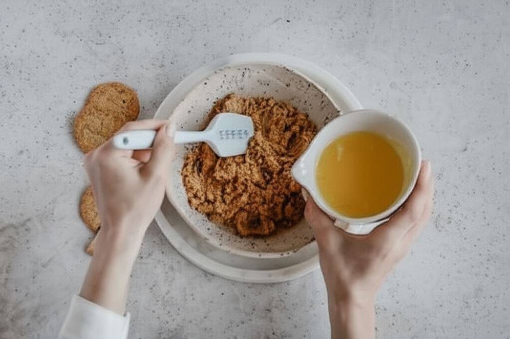 Naczynie do pieczenia smarujemy masłem. Zarówno spód formy jak i boki wykładamy papierem do pieczenia. Herbatniki drobno kruszymy. Masło rozpuszczamy i mieszamy z pokruszonymi ciasteczkami. Wszystko dokładnie łączymy.