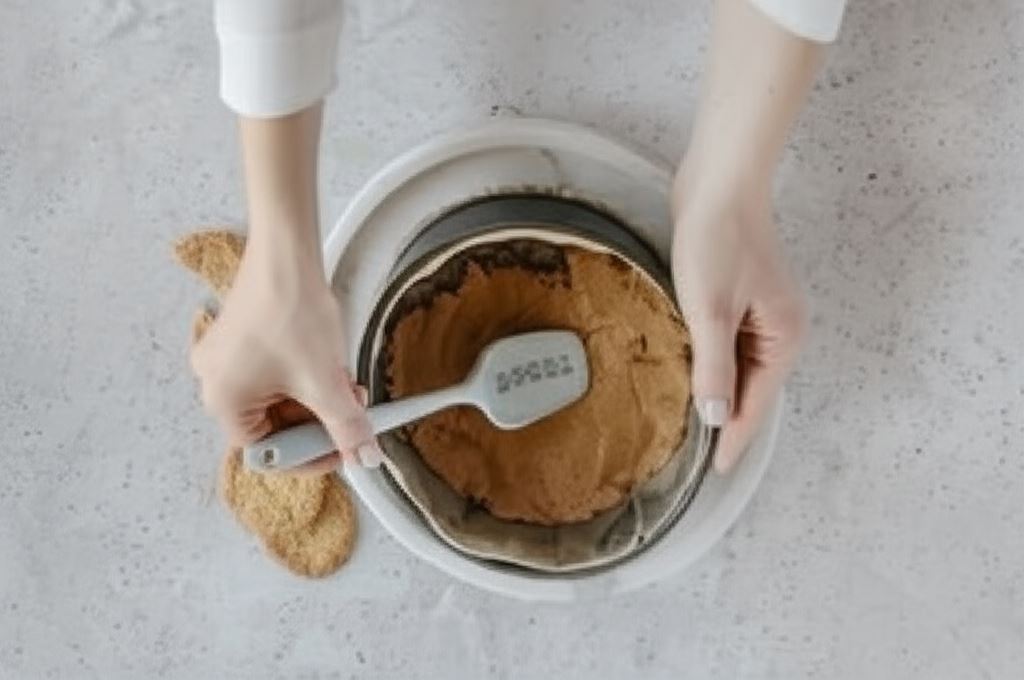 Przygotowaną masą wykładamy dno tortownicy i starannie ją uciskamy. Umieszczamy tortownicę w lodówce na 30 min.