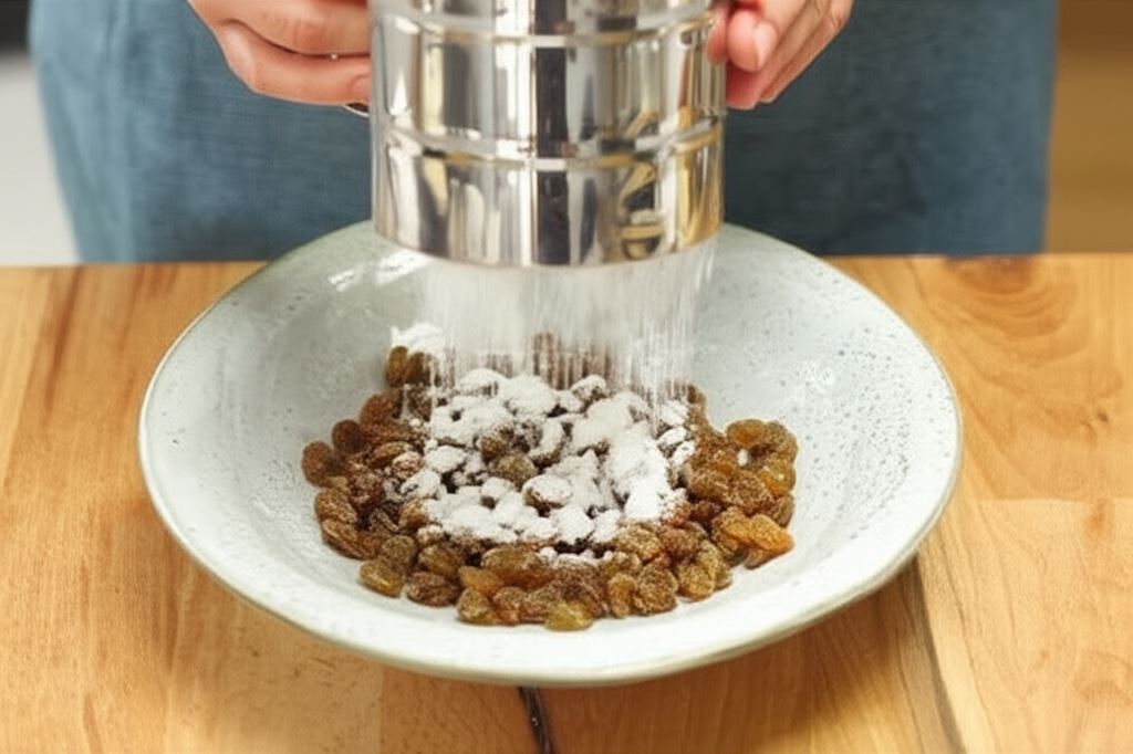 Rodzynki zalej gorącą, lecz nie wrzącą wodą. Odstaw na parę minut, odcedź i obsyp mąką ziemniaczaną.