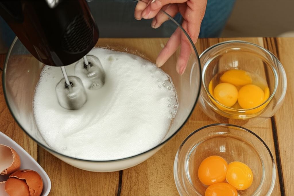 Oddziel białka od żółtek i ubij je na sztywną pianę z dodatkiem szczypty soli, po czym odstaw w chłodne miejsce.