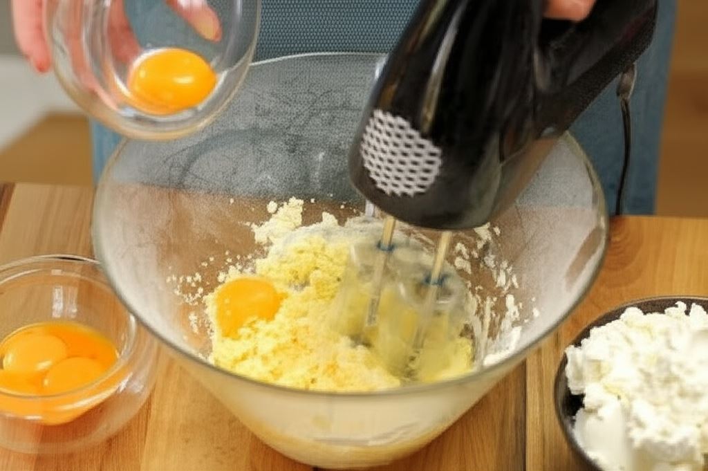 Potem wkładaj żółtka jedno po drugim, cały czas mieszając. Kiedy masa stanie się puszysta, zacznij dodawać twaróg małymi porcjami.