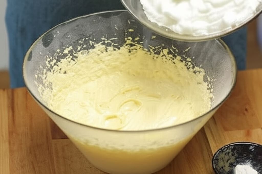 Masę ostrożnie połącz z ubitymi białkami, wsyp proszek do pieczenia i zamieszaj.