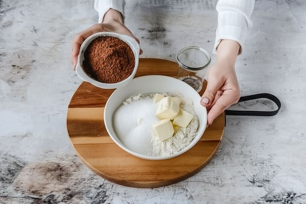 Składniki przeznaczone na spód wsypujemy do miski i rozgniatamy palcami, aż uformuje się kruszonka. Połowę porcji umieszczamy w lodówce.
