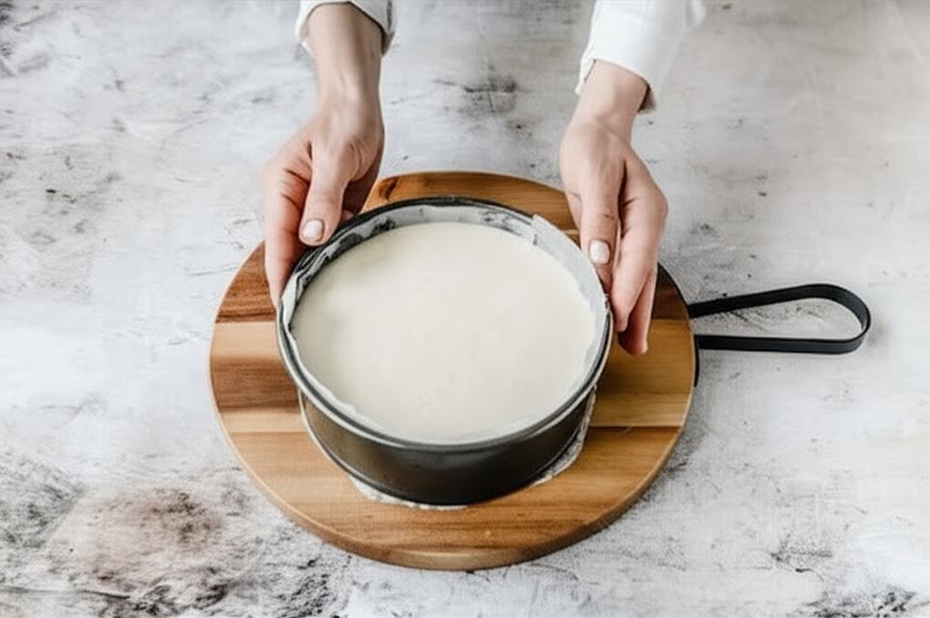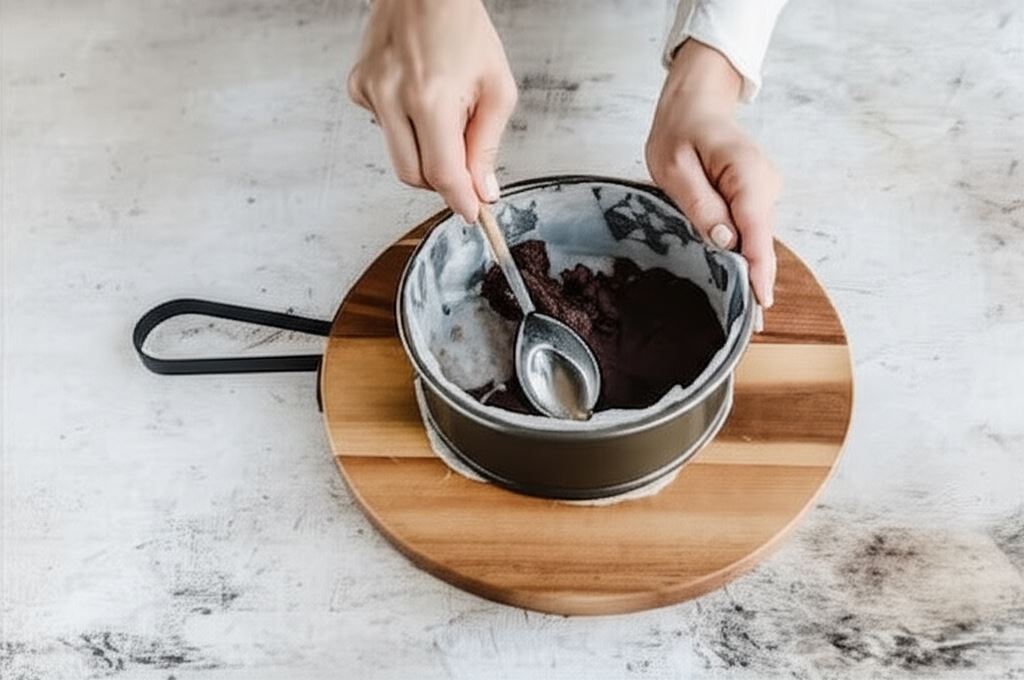 Formę do pieczenia smarujemy tłuszczem. Zarówno spód formy jak i boki wykładamy papierem do pieczenia. Część masy przesypujemy na dno tortownicy. Ugniatamy spód i zapiekamy w temp 180 °C około 15 min.