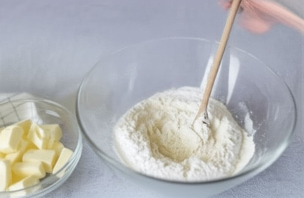 Przygotuj podstawę. Przesianą mąkę pszenną połącz w misce z cukrem pudrem i proszkiem do pieczenia. Dodaj masło, jajko i wyrób jednolite ciasto. Owiń folią i wstaw do lodówki na około 45 minut.